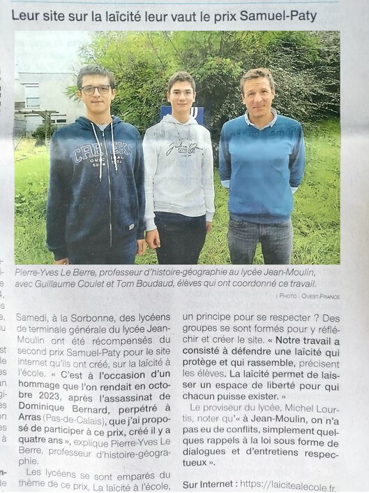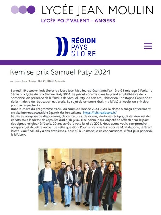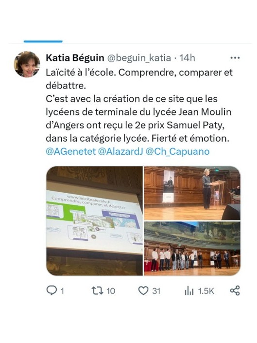 Ensuite, Guillaume Coulet, coordinateur du site, a décrit le projet en s’exprimant ainsi : « Vous savez, la laïcité est un sujet qui nous importe beaucoup. Ce projet nous a relié à cette cause, en nous faisant avancer d'un pas de plus vers nos devoirs de citoyen. Nous avons appris énormément : autant sur cette valeur que sur le travail en communauté, ce qui nous sera utile pour nos avenirs respectifs. C'est aujourd'hui un outil que l'on propose à l'ensemble des professeurs d'histoire géographie de France pour enseigner la laïcité sous différents supports. Nous voulons renseigner les plus jeunes, malgré les différences de point de vue. On espère maintenant qu'il laissera une trace autant chez les élèves que dans la communauté éducative. Merci encore d'avoir récompensé notre travail. »